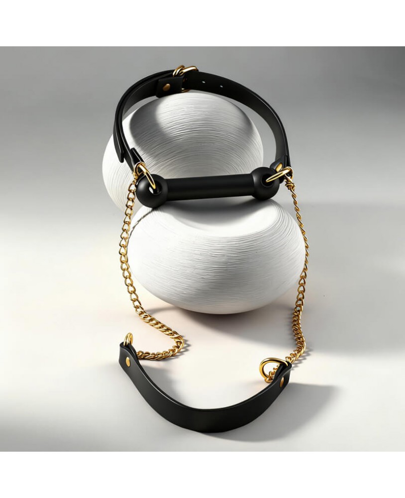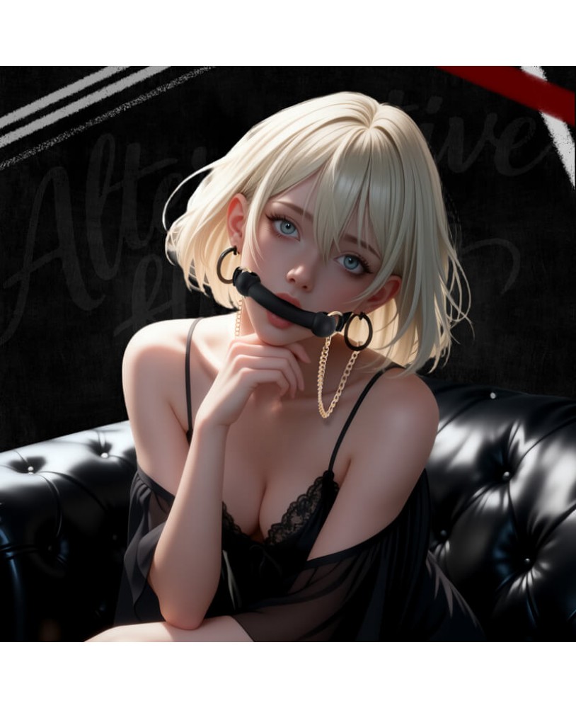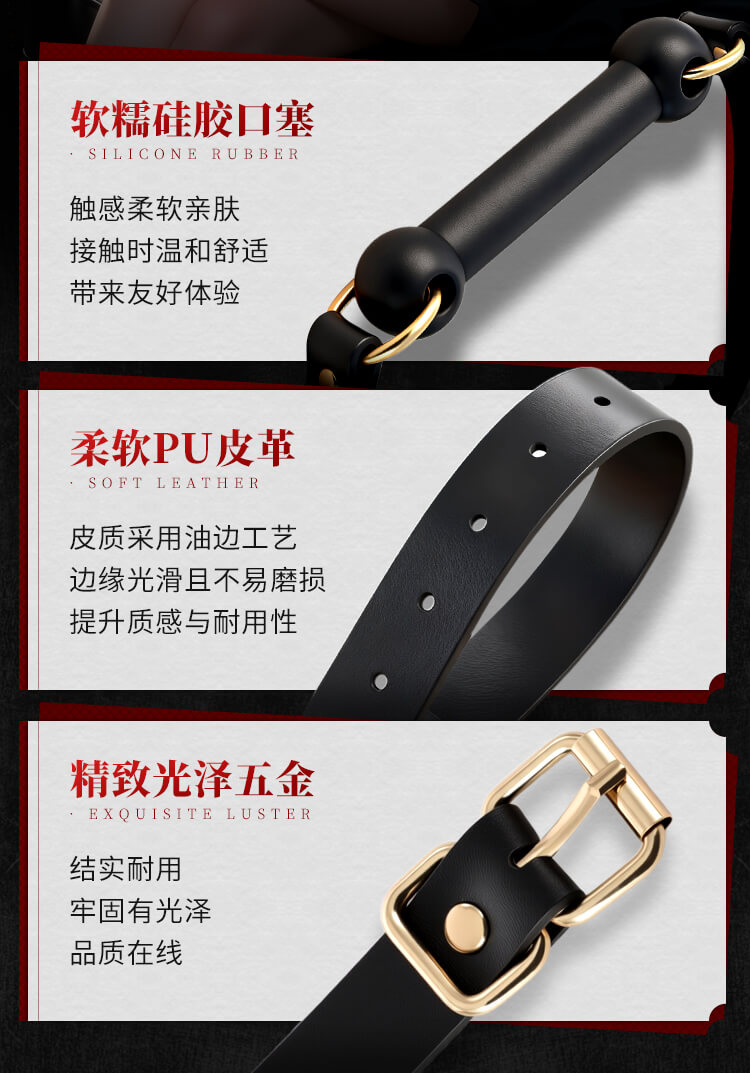 pitch-black silicone ball gag spans the mouth,