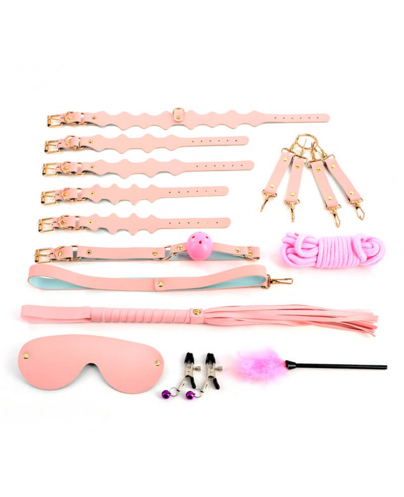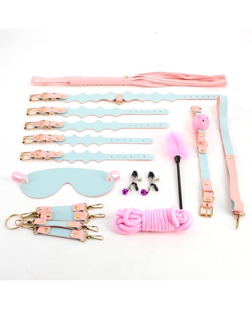Tags: Pink & Blue Dual-Color BDSM Bondage Set — Unlock the Secret Door to Your Sensual World.This exquisite reversible design features two distinct sides: one in soft, tender pink, the other in cool, seductive blue. A simple flip transforms your role — you can be the master in control or the submissive under command.Eye mask, ball gag, feather tickler, leash, handcuffs, ankle cuffs, cross restraint, nipple clamps, collar, whip, and bondage rope — a complete set that fulfills every fantasy, from binding and discipline to teasing, domination, and surrender.The eye mask blocks sight, turning mystery into the most powerful form of arousal.The ball gag silences your voice, yet makes every breath burn with desire.The feather tickler glides across the skin, awakening shivers of anticipation deep within.The handcuffs and ankle cuffs are soft yet firm, offering restraint with a touch of tenderness.The collar and leash symbolize belonging and trust — every pull and command reveals passion and control.The nipple clamps, whip, and bondage rope trace the fine line between pain and pleasure, where ecstasy is born.Each piece is crafted to fit your body and your fantasies perfectly.Made from soft, skin-friendly materials with a silky, delicate touch, it caresses every inch of your body, igniting desire between heat and sensation. The refined metal fittings are durable and lustrous —whether you’re a curious beginner or an experienced player seeking deeper thrills, this set invites you to explore without limits.