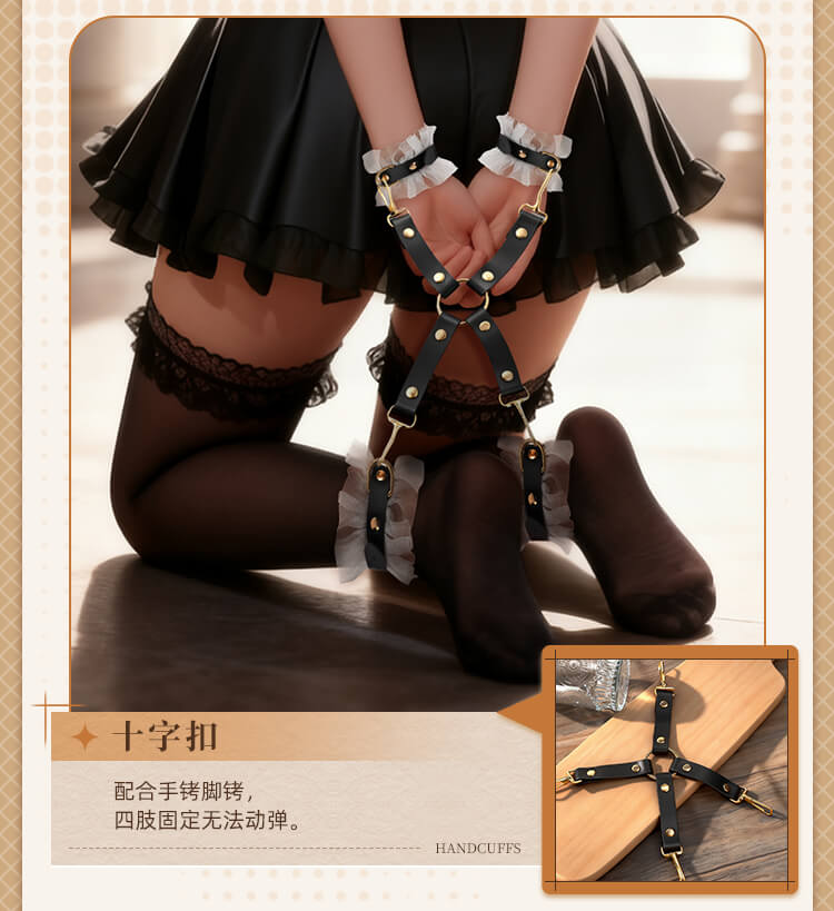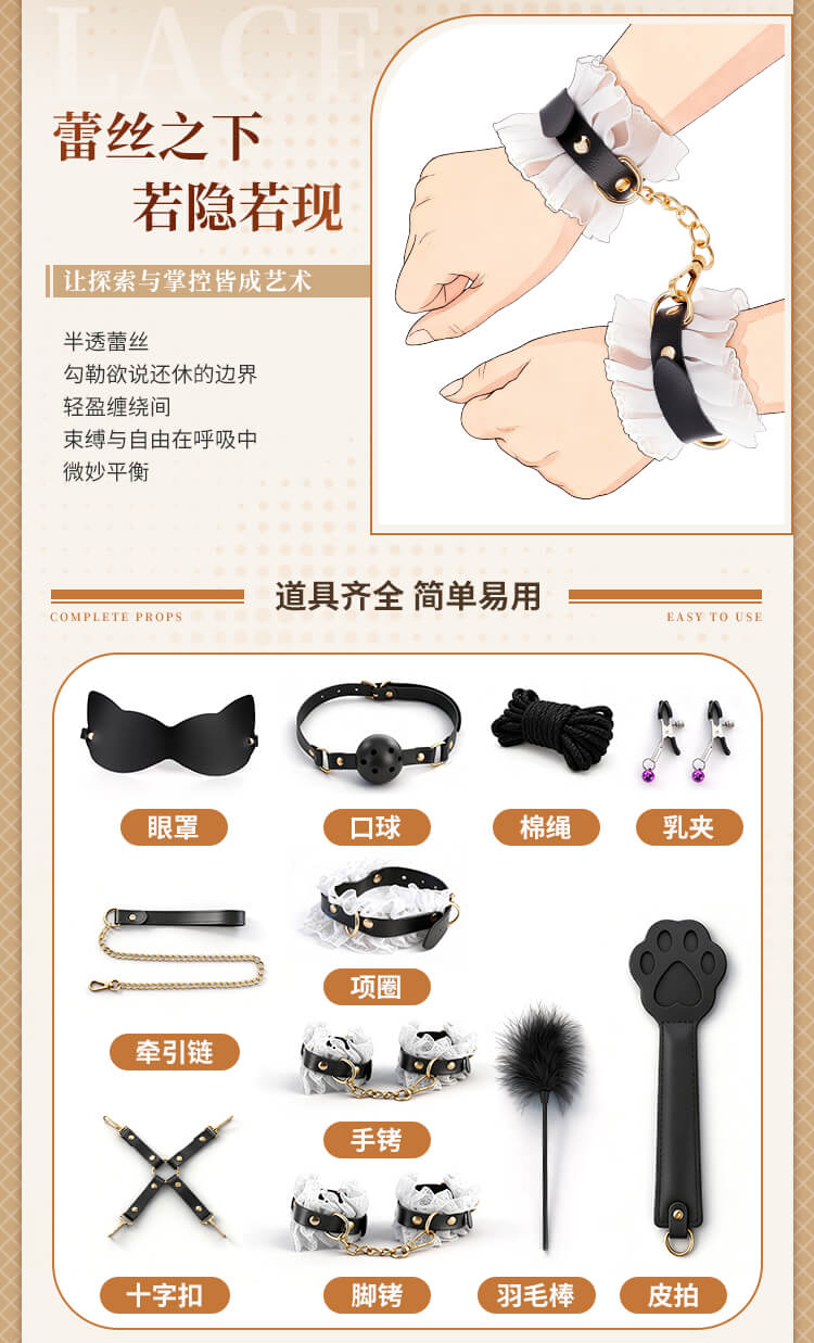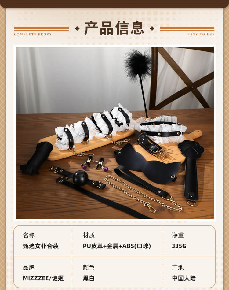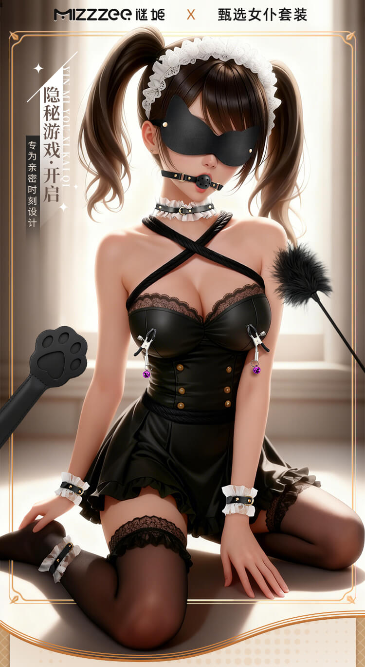Tags: In this sensory feast presided over by you, the air seems to ignite the moment it is touched. This is not just a set of restraint tools, but a ticket to ultimate obedience and deep longing. When the classic black-and-white elements of a maid's uniform meet the heart-pounding art of confinement, a drama of possession and being possessed begins.Translucent lace rests lightly upon the skin, indistinctly outlining the graceful curves of the body—the most direct expression of temptation. Fingers glide over the silk-smooth material; there is no pungent odor, only a fit and comfort akin to a second skin. Despite the extreme softness and romance presented visually, hidden beneath those layers of lace is a tough and solid craftsmanship, sturdy enough to support any wild and soulful adventure.Eleven meticulously selected instruments provide a full-scale lockdown from vision to touch. The moment the blindfold falls, the world plunges into darkness, and other senses are infinitely magnified. The aphasia brought by the gag turns every plea or moan of indulgence into a moving whimper. The cold collar locks tight, with one end of the leash held firmly by the master, declaring absolute ownership. The weight of the handcuffs and shackles, combined with the exquisite fixation of the cross-buckle, holds the body in its most alluring posture, awaiting further exploration.As that light feather tickler glides across the sensitive groin, followed by the waves of slight stinging heat from the leather paddle, the senses leap repeatedly between heaven and hell. The tug of the nipple clamps serves as a constant reminder of who the body’s true owner is, while the binding rope—meters long—slithers and coils like a python, perfectly fusing the lace maid outfit with the exquisite curves, tightly enveloping every inch of desire.This is more than just roleplay; it is a surrender of the soul. Don the maid set and let fragility and wildness reach a balance in the moment of intimacy. In every pull, every restraint, and every exchange of glances, all reserve scatters along with the folds of the lace, leaving only the most primitive, naked passion to grow wildly in the night where a faint fragrance drifts.