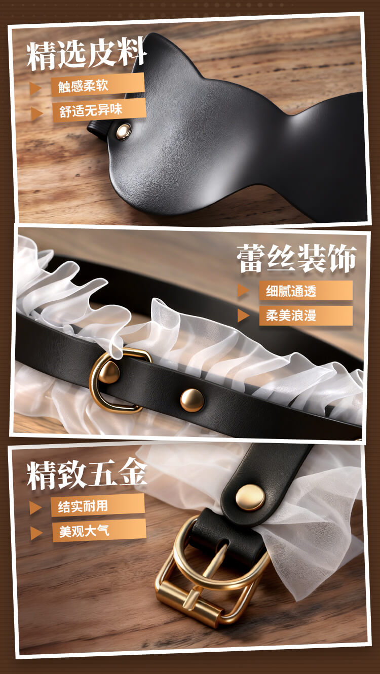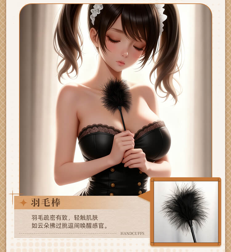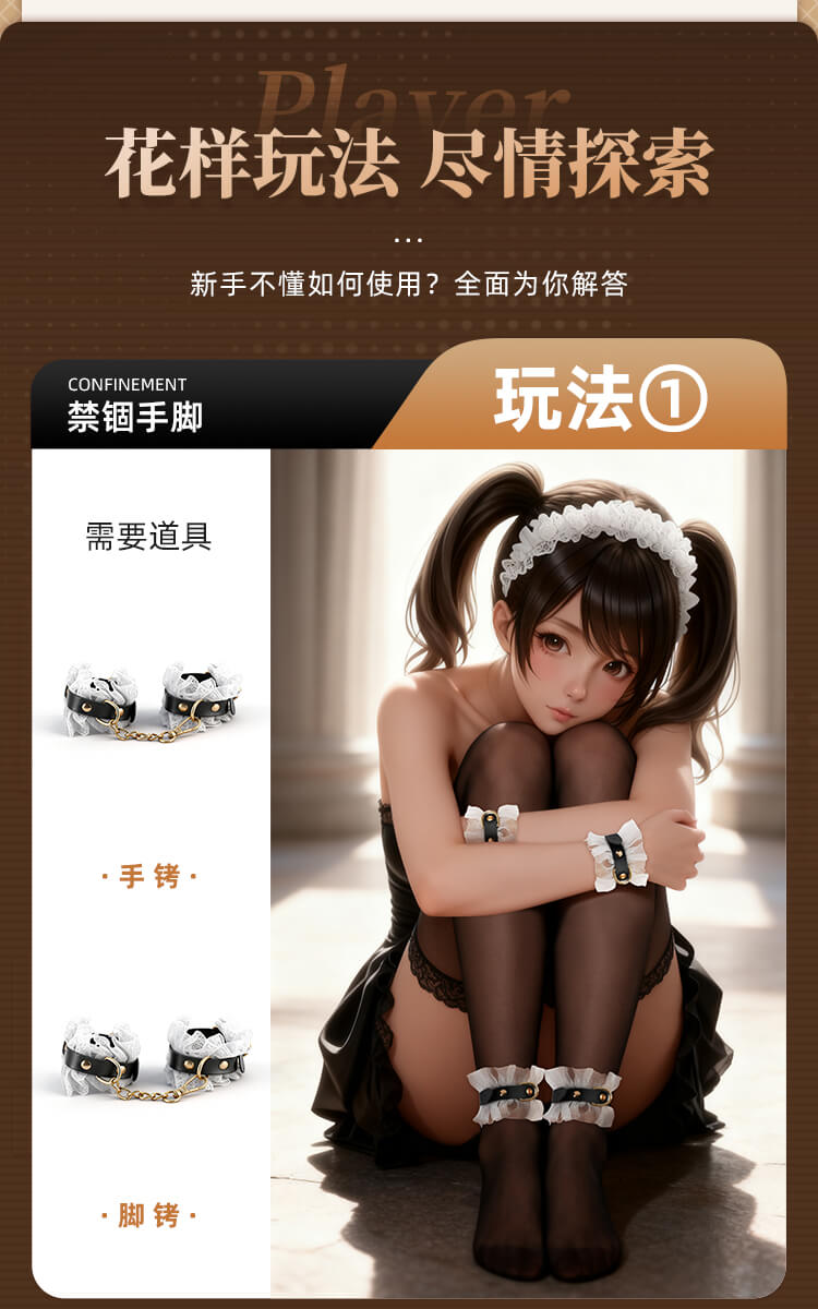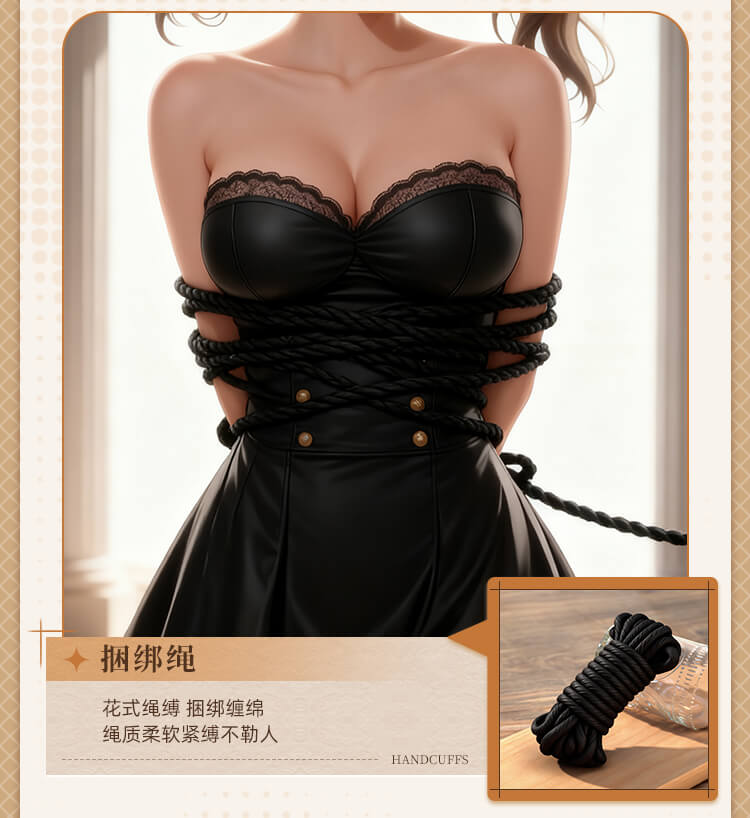 Tags: In this sensory feast presided over by you, the air seems to ignite the moment it is touched. This is not just a set of restraint tools, but a ticket to ultimate obedience and deep longing. When the classic black-and-white elements of a maid's uniform meet the heart-pounding art of confinement, a drama of possession and being possessed begins.Translucent lace rests lightly upon the skin, indistinctly outlining the graceful curves of the body—the most direct expression of temptation. Fingers glide over the silk-smooth material; there is no pungent odor, only a fit and comfort akin to a second skin. Despite the extreme softness and romance presented visually, hidden beneath those layers of lace is a tough and solid craftsmanship, sturdy enough to support any wild and soulful adventure.Eleven meticulously selected instruments provide a full-scale lockdown from vision to touch. The moment the blindfold falls, the world plunges into darkness, and other senses are infinitely magnified. The aphasia brought by the gag turns every plea or moan of indulgence into a moving whimper. The cold collar locks tight, with one end of the leash held firmly by the master, declaring absolute ownership. The weight of the handcuffs and shackles, combined with the exquisite fixation of the cross-buckle, holds the body in its most alluring posture, awaiting further exploration.As that light feather tickler glides across the sensitive groin, followed by the waves of slight stinging heat from the leather paddle, the senses leap repeatedly between heaven and hell. The tug of the nipple clamps serves as a constant reminder of who the body’s true owner is, while the binding rope—meters long—slithers and coils like a python, perfectly fusing the lace maid outfit with the exquisite curves, tightly enveloping every inch of desire.This is more than just roleplay; it is a surrender of the soul. Don the maid set and let fragility and wildness reach a balance in the moment of intimacy. In every pull, every restraint, and every exchange of glances, all reserve scatters along with the folds of the lace, leaving only the most primitive, naked passion to grow wildly in the night where a faint fragrance drifts.