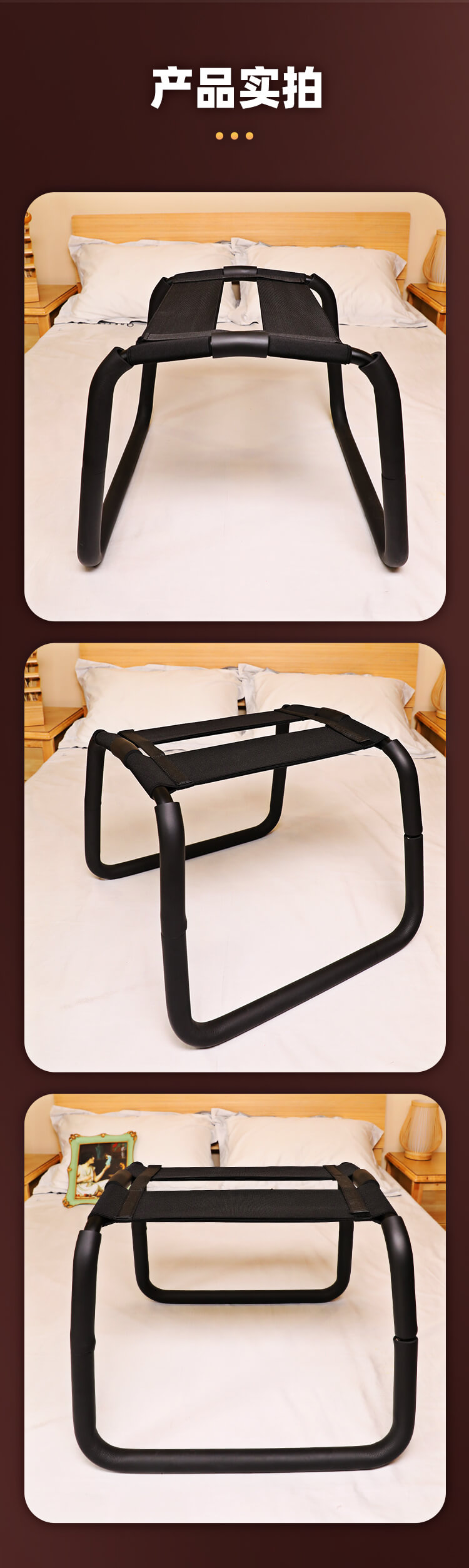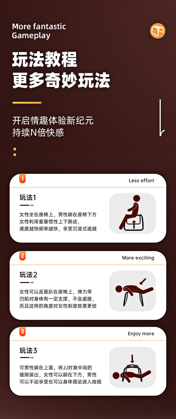 Tags: It is your ultimate companion for unleashing passion and exploring desire. This effortless, pleasure-enhancing Passion Chair allows you and your partner to fully experiment with a variety of intimate positions—over 30 ways to play, waiting for you to unlock one by one. Every time you sit, every movement you make, becomes a celebration of body and senses; every friction, every thrust, quickens the heartbeat and sets your blood on fire.The woman can freely sit on the chair, using her weight and momentum to move up and down, while the man lies below, quietly enjoying the pleasure delivered by the force and rhythm. The faster the motion, the higher the frequency, and the more intense the stimulation. Each sway feels like a challenge to your limits. You can freely explore angles, rhythms, and depths, discovering unprecedented experiences of passion. Every position brings a distinct sensation, making your intimate moments fresh, exciting, and full of surprises.Safety and comfort are equally important. The reinforced frame paired with soft sponge padding ensures stability and durability, resisting bending even during intense movements, without causing discomfort. The four-layer elastic bands provide excellent rebound, accurately supporting every fast jump or slow sway, allowing you to fully immerse yourself in pleasure without worrying about safety.Ingeniously designed, this Passion Chair is easy to assemble and disassemble, and convenient to carry anywhere. Whether enjoying private moments at home or exploring new adventures while traveling, it effortlessly delivers. More than just a piece of furniture, it’s a device to release desire and ignite passion.Let this chair become your secret playground, where every intimate interaction is filled with novelty, excitement, and irresistible temptation. The deeper you explore, the harder it is to resist—over 30 positions await your conquest, ready to unleash your rawest, most primal desires.