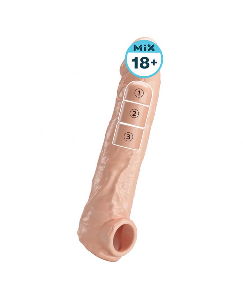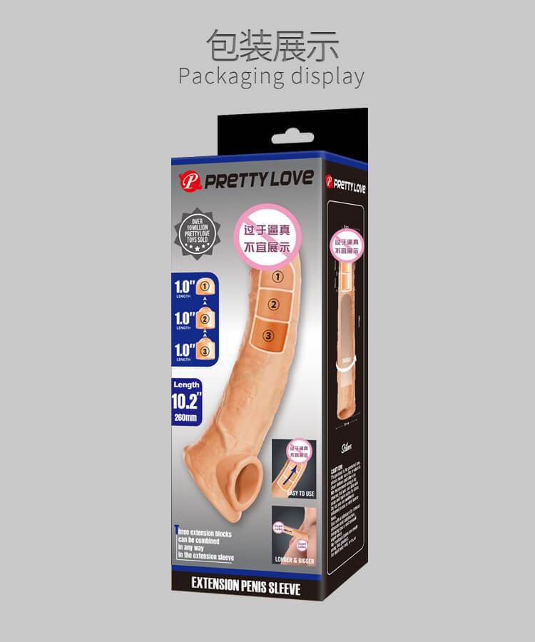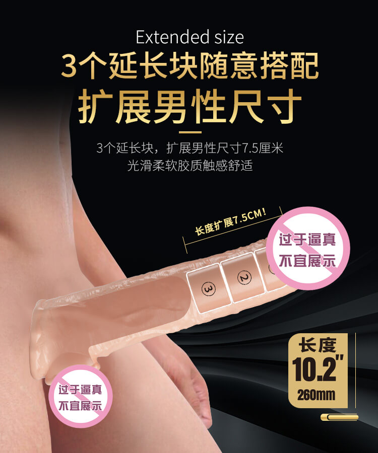 Tags: A visual feast of conquest and expansion awaits every warrior eager to break through their limits. This is not just an extension sleeve; it is a legendary upgrade to reshape your majesty and dominate the battlefield. The premium soft-gel material, silk-smooth and skin-warm, merges with you instantly, eliminating any cold, synthetic sensation. With a staggering total length of 260mm, it gives you the capital to overlook all rivals, ensuring that every thrust delivers a colossal shock that reaches the very depths of the soul. It is an extension of power and an unquestionable totem of true masculinity.The true carnival lies in its aggressive extension logic. Three independent "desire blocks, " each representing an absolute height of 2.5cm. You can stack and combine them at will, according to her cravings or your ambition. When all three are fully loaded, a total of 7.5cm of extra territory will completely rewrite the depth of the battle, reaching wildernesses that have never been explored. The textured veins covering the surface are like pulsating lifelines, triggering waves of numbing ecstasy against her inner walls with every stroke. This visible dimensional expansion, paired with the undulating texture beneath the fingertips, makes this sensory confrontation more raw and frenzied than ever before.In the heat of the battle, it serves as your secret shield for endurance. The powerful tension ring at the base utilizes physical assistance to firmly lock in the surging magma, maintaining a peak state of engorgement. It doesn't just bring your size to a visual pinnacle; it buys you nearly limitless combat duration in real-time action, stretching every thrust into an eternity. As you gallop freely across that warm, moist wilderness, feeling the deep reach of every added block, your partner’s broken pleas and tight embrace will become your proudest medals of honor.Stop letting nature limit your imagination. This customizable soft-gel extension sleeve ensures that pleasure is no longer restricted by birth. Under the tight wrap and ultimate visual impact, every deep thrust is an expansion of territory, and every layer added is a doubling of happiness. Let this powerful "armor" help you cross the boundaries of taboo, and amidst the symphony of sweat and moans, experience the ultimate charm of total dominance that leaves your partner completely surrendered.