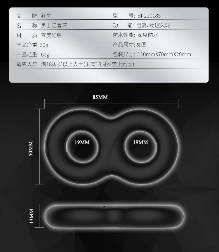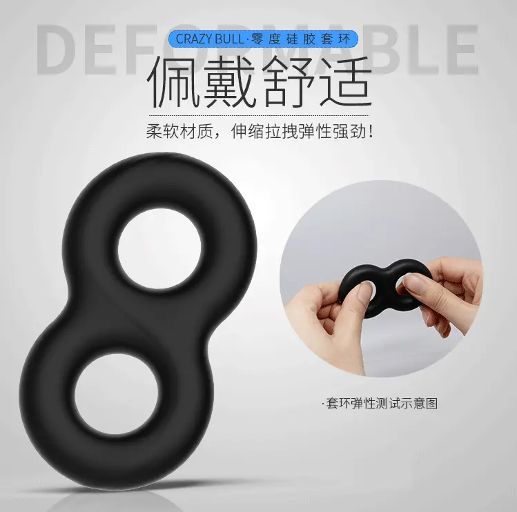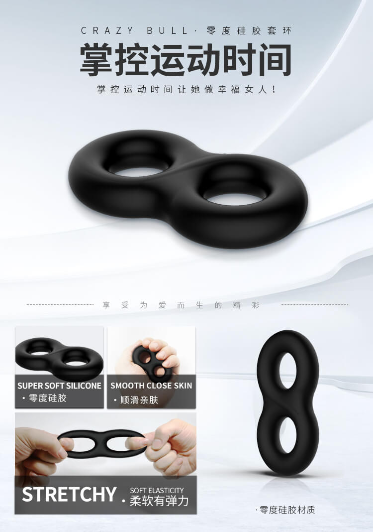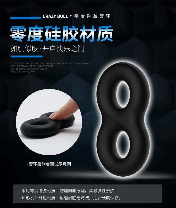 Tags: The unique 8-shaped structure features two separate circular openings — the upper ring fits snugly around the base of the penis, while the lower ring wraps around the scrotum, creating a double-restraining effect. Its elliptical outer contour follows the body’s natural curves, ensuring a more stable and comfortable fit. This dual-loop design provides multiple benefits simultaneously — enhanced endurance, firm support, improved blood engorgement, and a visually fuller appearance.Crazy Bull invites you into a game of control and release, crafted with exquisite precision. Made with the brand’s exclusive Super Soft Silicone, it feels soft, smooth, and silky — as gentle as real skin, yet with hidden strength beneath the surface. It stretches, pulls, and bends freely, boasting excellent elasticity without easy breakage, delivering a lifelike frictional sensation that clings to your body like a second skin.Its secret lies in the pure principle of physical performance enhancement. By gently tightening the base of the penis, it helps reduce blood outflow and maintain a firm, full erection — enhancing both hardness and stamina. No medication needed — just a natural way to achieve longer-lasting control and deeper pleasure.This is a physical marvel — one that helps you stay harder, last longer, and feel more in control. Its ergonomic precision design perfectly conforms to male anatomy, offering comfortable wear while truly delivering a physical delay effect — making every encounter last longer and every rhythm more controlled. Every tightening, every release, is a precise command over desire.When you wear it, you’re no longer just a participant — you are the master of time.Find your rhythm, embrace the comfort, surprise your partner — and take control of your pleasure.